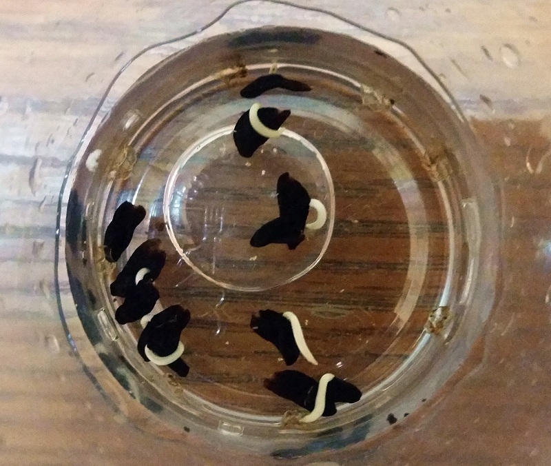 Some seeds germinate well in water. A simple method to sprout these seeds uses 2 plastic cups, one of which has holes on the bottom. This makes it easier to strain out the seeds when replacing the water each day. Just avoid making the holes too big, or the root or seed may get stuck in it (I use pointy scissors to make the holes).