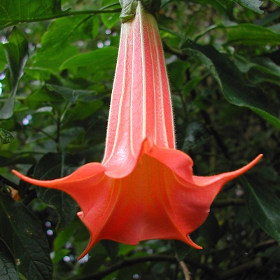 the soil down in the root zone has the right moisture, consider using a moisture meter Fertilizing -- Like other Brugmansias, this one likes regular feeding. Feed about every 2 months with a general-purpose fertilizer that contains micronutrients (I use this one). Avoid feeding if your plant goes through a period of slow growth, like during hot or cold temperatures. It's normal for an older leaf to occasionally turn yellow and drop, but if it seems excessive, the soil may be too dry down in the root zone. If you are certain the soil is moist, the plant may need more nitrogen fertilizer. If the new growth turns yellow with green veins, the pH of your soil or water is probably too high (alkaline). Try using a citrus fertilizer if this occurs, or switch to bottled water or rainwater. Transplanting - When your seedlings are about 4-6 weeks old, repot to containers about 1 quart (1 liter) in size, and then on to 1-2 gallons (4-8 liters) a few months later. It's a good idea to water the soil before repotting, to keep the soil ball from breaking apart, which can damage the roots. Wait until your plants are 15 inches (35 cm) tall before planting them in the ground (in suitable climates). If you plan to keep them in containers indefinitely, the final size of the pot will depend on how large you let your plant grow. A full-size tree may need a very large pot! You may prune your plants to any size that is convenient. Lighting -- Dappled sun or morning sun is usually best. Protect the plants from strong afternoon sun, especially in warm climates. They can take full sun in cool climates like coastal California, but they will need more fertilizer and water. Climate -- This Brugmansia is happiest with temperatures below the low 80s (28°C), and nights that are cool (below 65°F / 18°C). It might not thrive in consistently hot conditions, particularly if nights are warm. It can probably survive a few degrees of frost, but i recommend protecting it from freezing temperatures. Over about 40% humidity is best. Over about 40% humidity is best. Indoors, if your plants seem to suffer from low humidity, consider using an ultrasonic room humidifier. Pests -- Watch for any pests that can affect your other plants. Try using insecticidal soap before using stronger remedies, since some may harm the plant. If you have any questions or problems, feel free to contact me. Have fun growing them! - Jeff Strange Wonderful Things